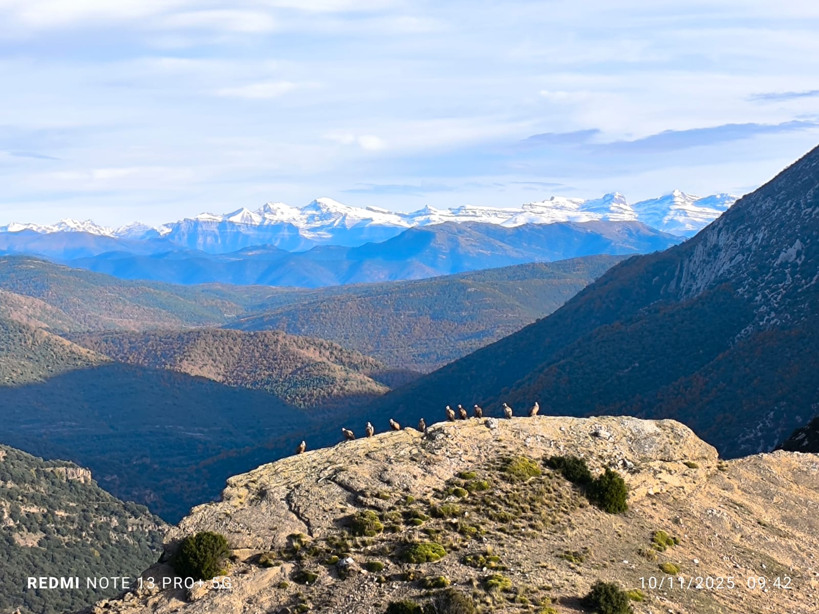 En haut du plateau, une escadrille de vautours nous attend sagement juchée sur les rochers, et en pleine observation du massif du Mont Perdu enneigé. Double cadeau de la nature.